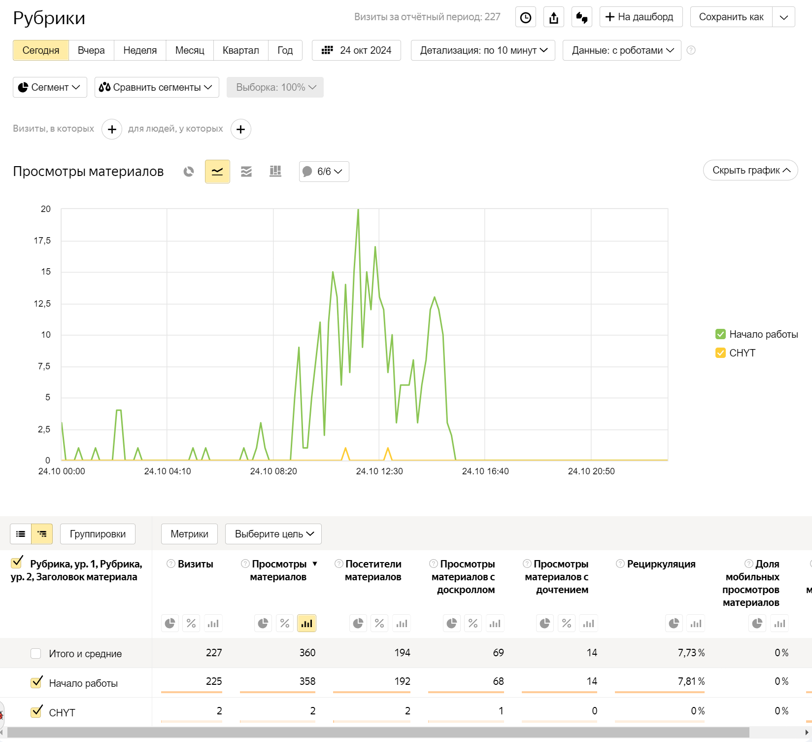 Если разметка верна и правильно подключен счетчик, через некоторое время по материалу начнет собираться статистика в Метрике. |