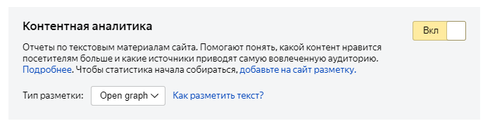 В настройках счетчика включите опцию «Контентная аналитика» и укажите тип разметки
